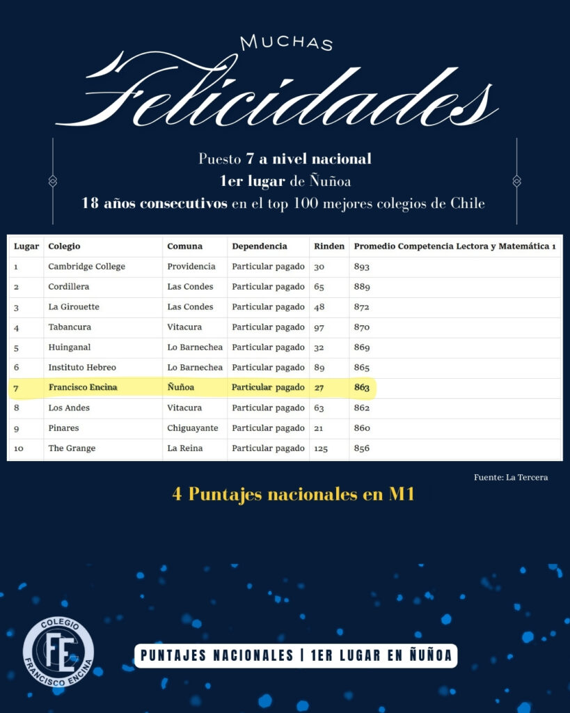 En la más reciente medición, nuestro establecimiento alcanzó el puesto 7 a nivel nacional, posicionándose además como el primer lugar en la comuna de Ñuñoa. Este logro cobra aún mayor relevancia al considerar que el colegio suma 18 años consecutivos dentro del Top 100 de los mejores colegios de Chile, consolidando una trayectoria de resultados consistentes en el tiempo.